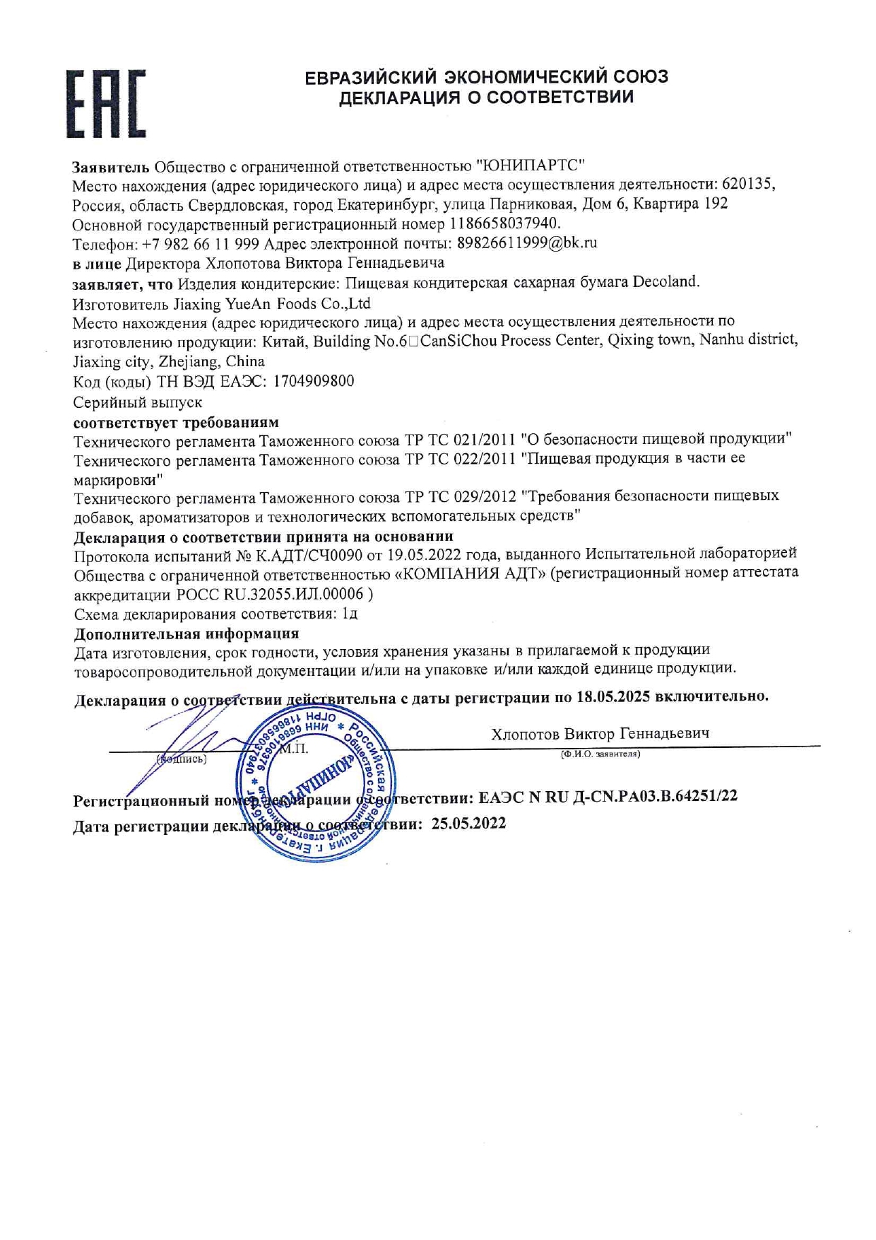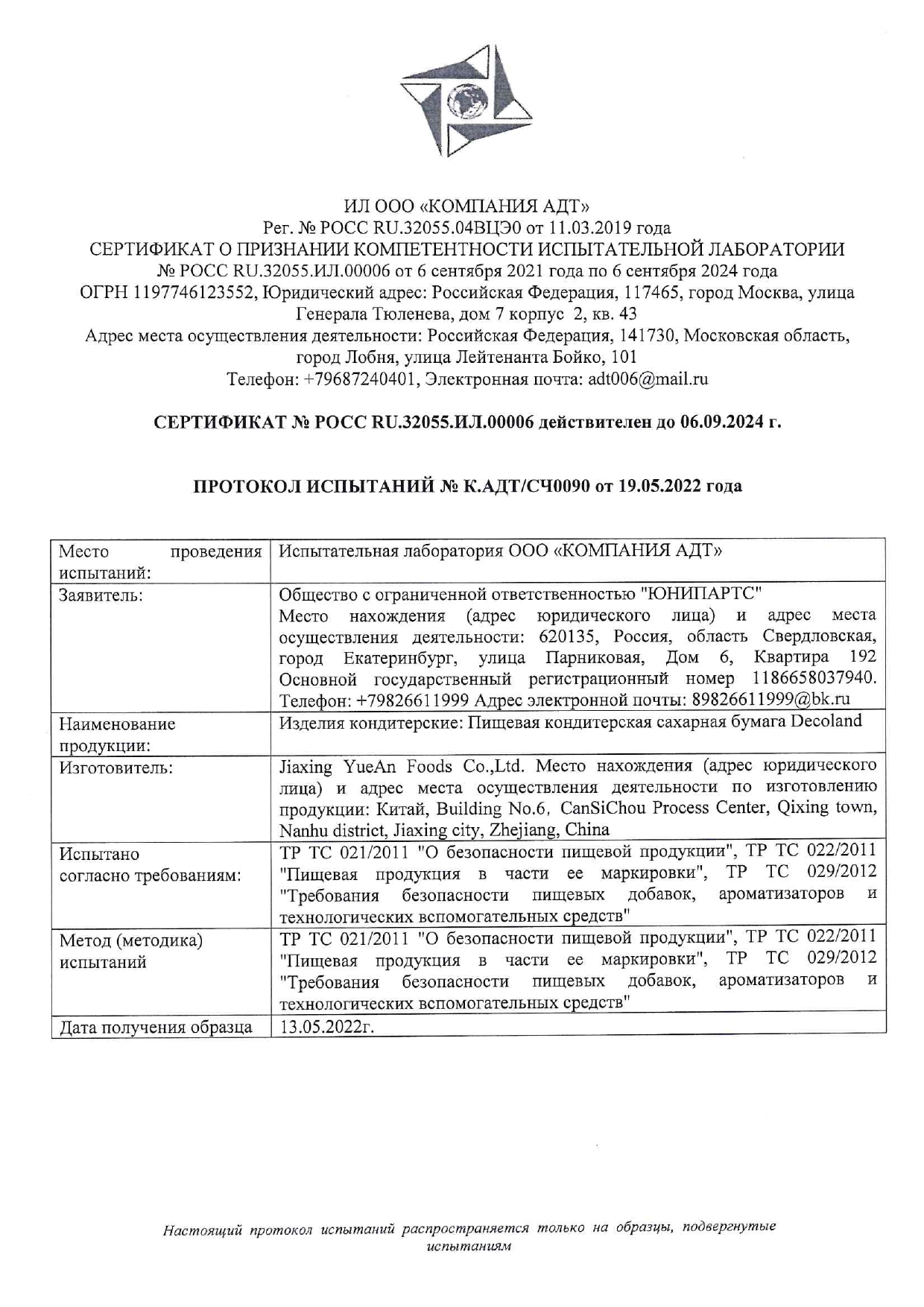 Реквизиты: ООО "ЮНИПАРТС"